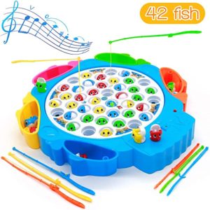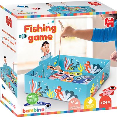 Das Angelspiel mit über 40 Cartoon–Fischen kann man mit der ganzen Familie spielen. Die Fische drehen sich zu der Musik und machen hin und wieder ihr Maul dabei auf. Das Angelspiel eignet sich für Kinder ab 3 Jahren und fördert die Hand–Augen–Koordination.