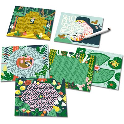Geh im Dschungel auf Entdeckungsreise! Auf den Vorderseiten findest du 19 Labyrinthe zum Lösen und mit den Rückseiten kannst du ein Riesenlabyrinth zusammenlegen!