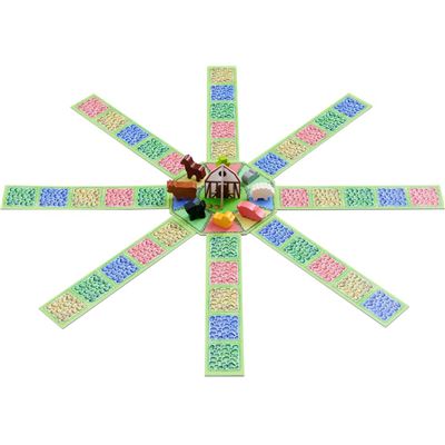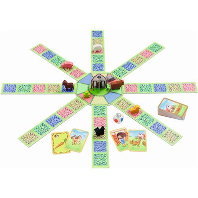 Inhalt: 1 Start-Spielplan, 8 Weg-Streifen, 1 Würfel, 8 Holztiere, 1 Scheunen-Aufsteller, 1 Kartensatz, 1 Spielanleitung.