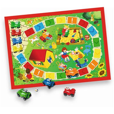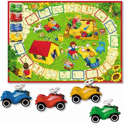Inhalt: 4 Bobby Cars, zweiseitiger Spielplan, 1 Würfel, Spielanleitung.