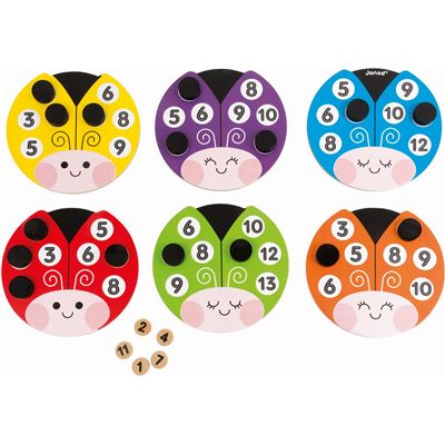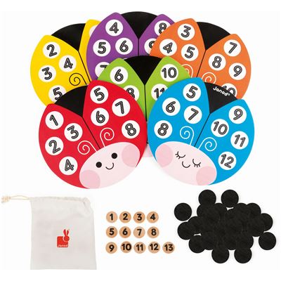 Für 2 bis 6 Spieler – Von 3 bis 6 Jahren. Spiel bestehend aus 6 Plättchen, 13 nummerierten Holztäfelchen im Baumwollsäckchen und 48 schwarze Holztäfelchen. Klassisches Lottospiel mit Karten in Marienkäferform. Die verwendeten Zahlen (1 bis 13) kennen die Kleinen schon ab dem Alter von 3 Jahren.
