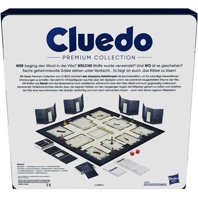 Bei Cluedo Premium Collection handelt es sich um eine prachtvolle Geschenkausgabe des beliebten Familienspiels. Dank des eleganten Designs und der hochwertigen Spielelemente lässt sich diese Version von Cluedo stolz präsentieren und kann auch für nachfolgende Generationen zum Lieblingsspiel werden. In dieser Premium Edition können Sie Ihren Verdacht geheim halten und mit den Notizblock-Schilden die Villa in einem neuen Blickwinkel betrachten. Atemberaubende Illustrationen, hochwertige Materialien und ein goldenes Finish werden Cluedo Fans begeistern. Nach dem klassischen Cluedo Spielprinzip versuchen die Spieler, herauszufinden, wer den Mord in der Villa beging, welche Waffe verwendet wurde und wo die Tat geschah. Auch in dieser edlen Version des Spieleklassikers werden während des Spiels Verdächtige durch geschickte Spielzüge ausgeschlossen. Diese Sammlerausgabe von Cluedo ist das perfekte Geschenk für Brettspiel-Fans ab 8 Jahren.