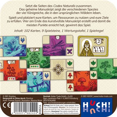 Setze die Seiten des Codex Naturalis zusammen! Das geheime Manuskript listet die unterschiedlichen Spezies der vier Königreiche auf, die in den alten Wäldern leben. Wem gelingt es, das Manuskript möglichst weit auszubauen und die Aufgabenkarten zu erfüllen? Das Kartenspiel Codex Naturalis lässt Köpfe rauchen und gleichzeitig wunderschöne Auslagen entstehen, indem die Spieler ihr eigenes Manuskript mit den Karten erstellen. Dabei müssen sie jedoch Kartenecken mit Ressourcen abdecken und immer wieder aufs Neue entscheiden, welche Ressourcen für sie wichtig sind und auf welche sie verzichten können, um möglichst viele Punkte durch Erfüllen der Aufgaben zu bekommen.