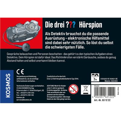 Unauffällig an streng geheime Informationen gelangen? Einen Dieb mit seinen eigenen Worten überführen? Dieses Abhörgerät gehört in jede Detektiv-Ausrüstung für Jungen und Mädchen ab 7 Jahren. Jetzt noch das Gerät nach Anleitung einrichten und unterschiedliche Geräuschquellen durchtesten. An welcher Wand oder an welchem Fenster lässt es sich besonders gut unbemerkt lauschen? Wie würden Die drei ??? Justus, Bob und Peter arbeiten? Ausgestattet mit einem Mikrofon, das die Geräusche verstärkt und Kopfhörern für den Lauschangriff, steht der nächsten Ermittlung nichts mehr im Wege! Am Gürtelclip befestigt, ist das Spielzeug immer schnell zur Hand. Das Detektiv-Spiel ist ein tolles Geburtstagsgeschenk für Rollenspiel-Fans und eignet sich als Mitbringsel zum Kindergeburtstag.