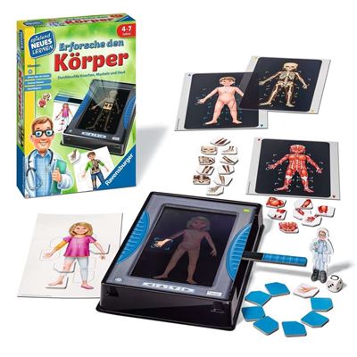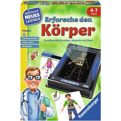 Bei dem Kinderspiel ‚Erforsche den Körper‘ wird der menschliche Körper spielerisch durchleuchtet: Dem Doktor sind leider seine Unterlagen total durcheinandergeraten. Deshalb braucht er dringend die Assistenz von Kindern ab 4 Jahren, die mit einem Durchleuchtungsgerät bestimmte Körperteile nach den Vorgaben auf den Spielkärtchen auffinden müssen. So lernen die Mitspieler den menschlichen Körper kennen und erwerben kindgerecht wertvolles Wissen über seinen Aufbau.