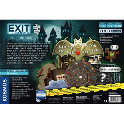 Mystery zum Puzzeln und Rätseln in einem! Aufregende Abenteuer warten auf Einsteiger in diesem kooperativen Escape Room Spiel: Jeder kennt das gruselige Schloss am Waldrand und jeder fürchtet sich davor. Jetzt ist Mut gefragt! Gemeinsam suchen die Spielerinnen und Spieler einen alten Mann, der spurlos verschwunden ist. Noch am Tag zuvor hatte er auf dem Dorfplatz verkündet, endlich den unheimlichen Schlossbesitzer ausfindig zu machen. Was ist auf der anderen Seite des Waldes geschehen? Das Team muss dem Entführten schnell zur Hilfe eilen! Dafür lesen sie die Abenteuergeschichte und setzen nacheinander vier Puzzles zusammen, die sie an einsame Orte und in schaurige Räume führen. Sie bestehen gemeinsam Gefahren und lösen clevere und überraschende Rätsel. Bei diesem Escape Room Spiel hilft das ganze Team mit!