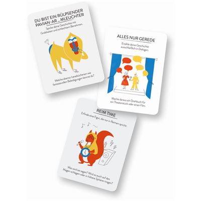 Entfesseln Sie mit ihren Kindern Hunderte von Geschichten aus der Tiefe Ihrer Vorstellungskraft. Wählen Sie eine Themenkarte, kombinieren sie mit einer Technikkarte und befeuern so Ihre Fantasie. Die 80 Karten verhelfen Ihnen zu einer eigenen, ganz besonderen Geschichte und bieten stundenlanges Geschichtenerzählen und kreative Schreibunterhaltung. Man braucht nur Bleistift und Papier – und einen Vampir… und ein singendes Pferd… und einen fliegenden Schirm…
