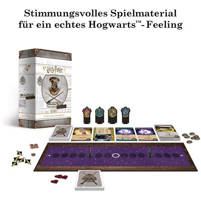 Inhalt: 1 Spielplan, 4 Haus-Karten, 8 Spielfiguren ‚Hogwarts Häuser‘, 2 Stellfüße, 24 Start-Karten, 31 Fluch-Karten, 129 Hogwarts-Karten, 5 Betäubt-Marker, 30 Plättchen, 1 Spielanleitung