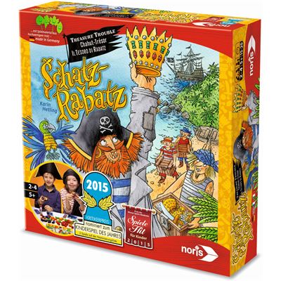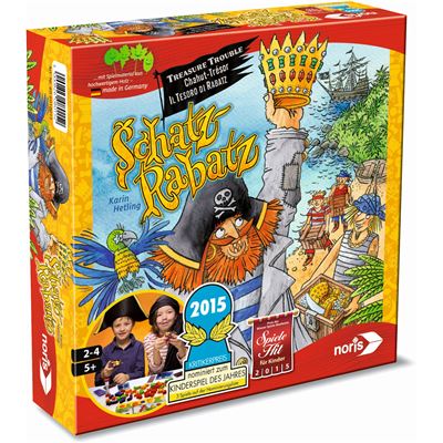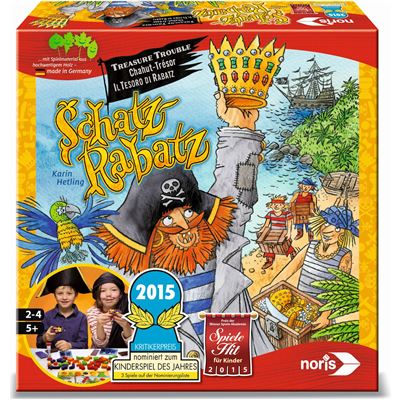 Schätze klauen und gut verstauen – darum geht es in „Schatz-Rabatz“. Unter Zeitdruck schnappen sich die Kinder die kleinen Preziosen für Käpt’n Raffzahn aus der Tischmitte und schichten sie in ihre Truhen, bis diese randvoll sind. Der Deckel muss aber noch draufpassen; sonst muss man wieder Platz schaffen. Ist die Sanduhr abgelaufen, wird gewertet. Und da kommt Juwelen-Jack ins Spiel: In jeder Runde zeigt eine Karte an, welche Schätze in welchen Farben der fiese Kerl als Tribut fordert. Diese werden aussortiert. Es lohnt sich also, nicht blindlings zuzugreifen, sondern möglichst vielseitig zu sammeln. Der jeweils erfolgreichste Spieler bekommt ein Teil seines eigenen Piratenschiffs. Ist das vollständig, hat er gewonnen – und kann aufbrechen zu neuen Abenteuern mit einer taktischen Variante.