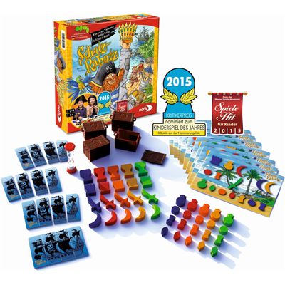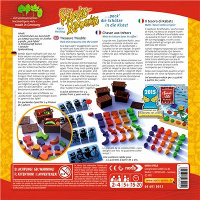 Inhalt: 4 Schatztruhen aus Kunststoff, 40 Schätze aus Holz, 5 Farben, 9 große Jack Tafeln, 16 Piratenschif-Karten, 1 Sanduhr, Spielanleitung.
