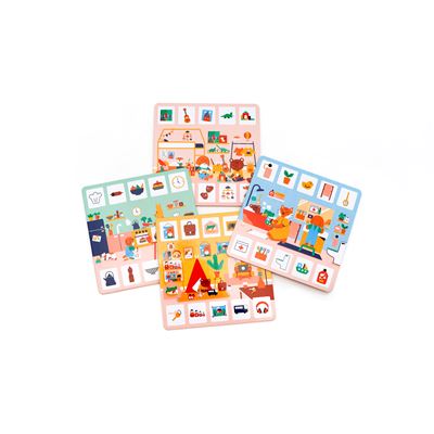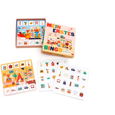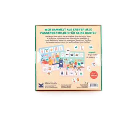 Wer sammelt als Erste*r alle passenden Bilder für seine Karte? Mein erstes Bingo. Zu Hause enthält vier verschiedene Bingo-Karten, auf denen je ein Zimmer mit dazugehörigen Gegenständen abgebildet ist. Schon die Kleinsten werden mit Begeisterung die vertraute Welt ihres Zuhauses entdecken und mit viel Spaß ihre Bingo-Karten befüllen!