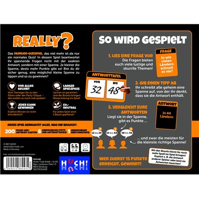 Haben Sie sich schon einmal gefragt, in wie vielen Ländern es nie schneit oder wie viel Prozent der deutschen Bevölkerung tätowiert ist? Das Party-Quiz-Spiel „REALLY?“ fordert Sie zum Einschätzen einer bunt gemischten Fragenflut ein. Das Spannende daran ist: Die Spieler können eine Spanne (von … bis) als Antwort eintragen. Der Spieler mit der kleinsten Spanne erhält die meisten Punkte. „REALLY?“ von HUCH! mischt jeden Spieleabend auf und sorgt für viele erhellende Erkenntnisse über uns und unsere Welt