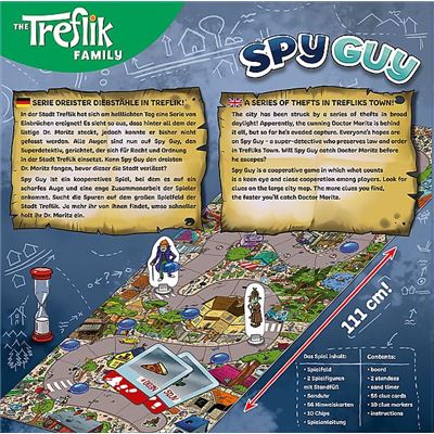 In Treflikow hat es eine Serie von Raubüberfällen bei Tageslicht gegeben! Es wird gemunkelt, dass der hinterhältige Doktor Mortiz hinter all dem steckt, aber bisher wurde er noch nicht gefasst. Schlüpfe in die Rolle von Spy Guy, einem Superdetektiv, der in der Stadt für Recht und Ordnung sorgt. Suchen Sie auf dem riesigen, über einen Meter langen Brett nach Hinweisen und versuchen Sie, den Bösewicht einzuholen, bevor er aus Treflikow flieht.