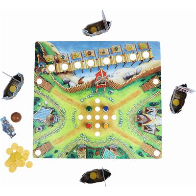 Inhalt: 1 großer Spielplan „Wikingertal“ (gepuzzelt aus 7 Teilen), 8 Gewinnflaggen, 4 Wikingerchips, 1 Pappteil „Kugelschubser“, 4 Schiffe (aus je 4 Pappteilen), 1 Kugel, 24 Goldmünzen, 4 Holzfässer, 1 Spielanleitung.