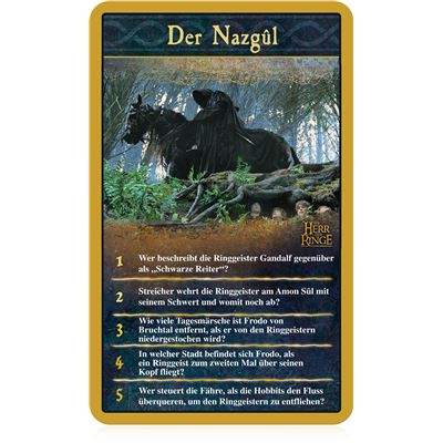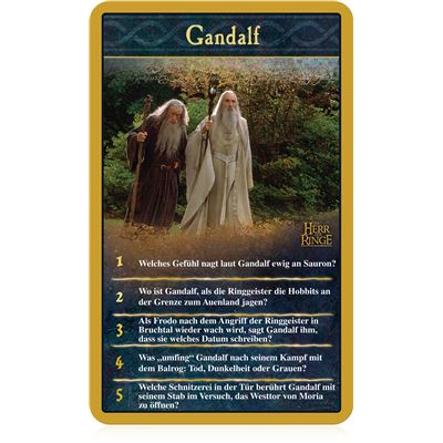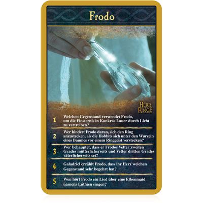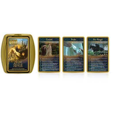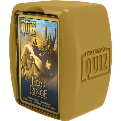 Ein Ring, sie zu knechten, sie alle zu finden – diesen Vers kennen natürlich alle Fans von Herr der Ringe nur zu gut und können es kaum erwarten, das Ringgedicht zu vollenden. Doch kennt ihr euch wirklich mit der Welt aus Tolkiens Feder aus und könnt jede Frage beantworten? Stellt euer Wissen über Mittelerde im TOP TRUMPS Herr der Ringe-Quiz unter Beweis und haltet eure Augen nach der Karte mit dem Einen Ring offen: Reibt ihr diesen, wird dessen geheime Inschrift durch die Wärme sichtbar, ganz wie beim Original!