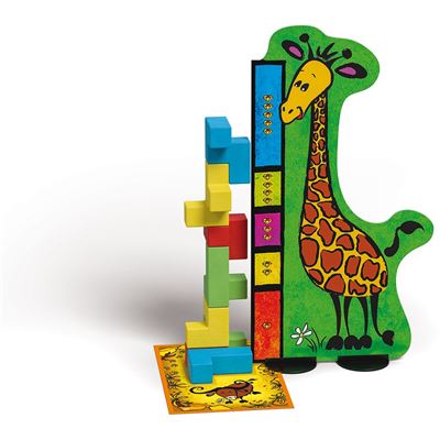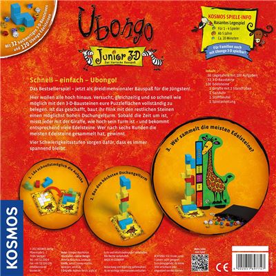 Gleichzeitig und so schnell wie möglich legen die Spieler ihre Bausteine auf die Grundfläche. Dabei darf kein Kästchen frei bleiben und nichts über den Rand hinausragen. Ist das geschafft, bauen die Spieler flink mit den restlichen Steinen einen möglichst hohen Ubongo Dschungelturm. Nach 90 Sekunden ist die Zeit um. Nun kontrolliert jeder der Reihe nach, ob die Grundfläche richtig belegt ist und misst dann mit der Giraffe die Höhe des eigenen Turms. Je höher der Turm, desto mehr Edelsteine gibt es dafür. Wer am Ende die meisten Edelsteine besitzt, gewinnt diesen tierischen Bauspaß!