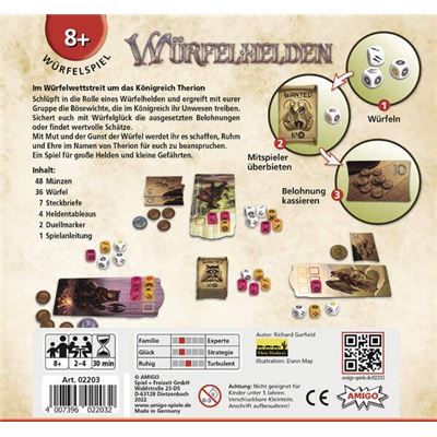 Bei Würfelhelden schlüpfen die Spielenden in die Rolle eines Helden oder einer Heldin und ergreifen mit ihrer Gruppe die Bösewichte, die im Königreich ihr Unwesen treiben. Mit Würfelglück sichern sie sich die ausgesetzten Belohnungen oder finden wertvolle Schätze.