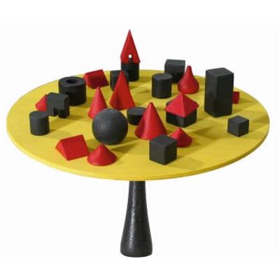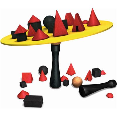 Auf der Spitze eines Holzsockels liegt eine Korkkugel, auf der eine Platte mit ca. 25 Holzteilen ausbalanciert wird. Diese Holzteile haben unterschiedliche Formen und Gewichte! Reihum nehmen die Spieler je ein Holzteil von der Platte, ohne diese aus dem Gleichgewicht zu bringen. Unglaublich, welche Schräglagen möglich sind! Kippt die Platte von der Kugel, endet das Spiel. Gewinner ist, wer bis dahin die meisten Teile abgeräumt hat.